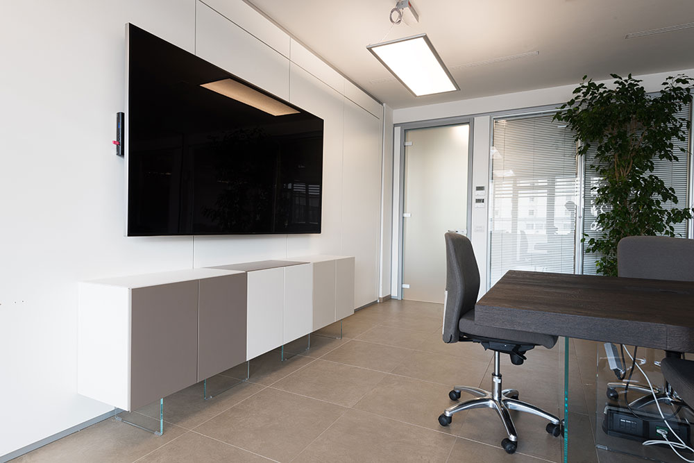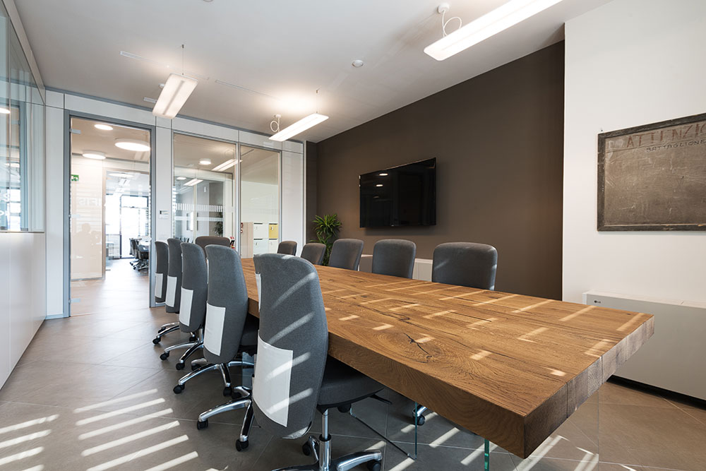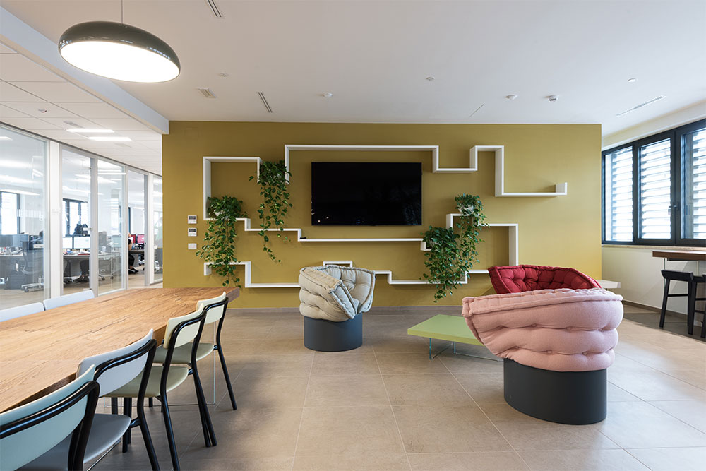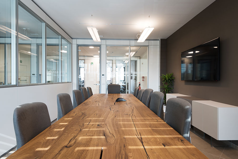 Le immagini documentano le aree di ingresso, gli uffici operativi e gli ambienti destinati agli incontri con la clientela. In una sede bancaria, la configurazione degli spazi contribuisce a trasmettere solidità e affidabilità.
