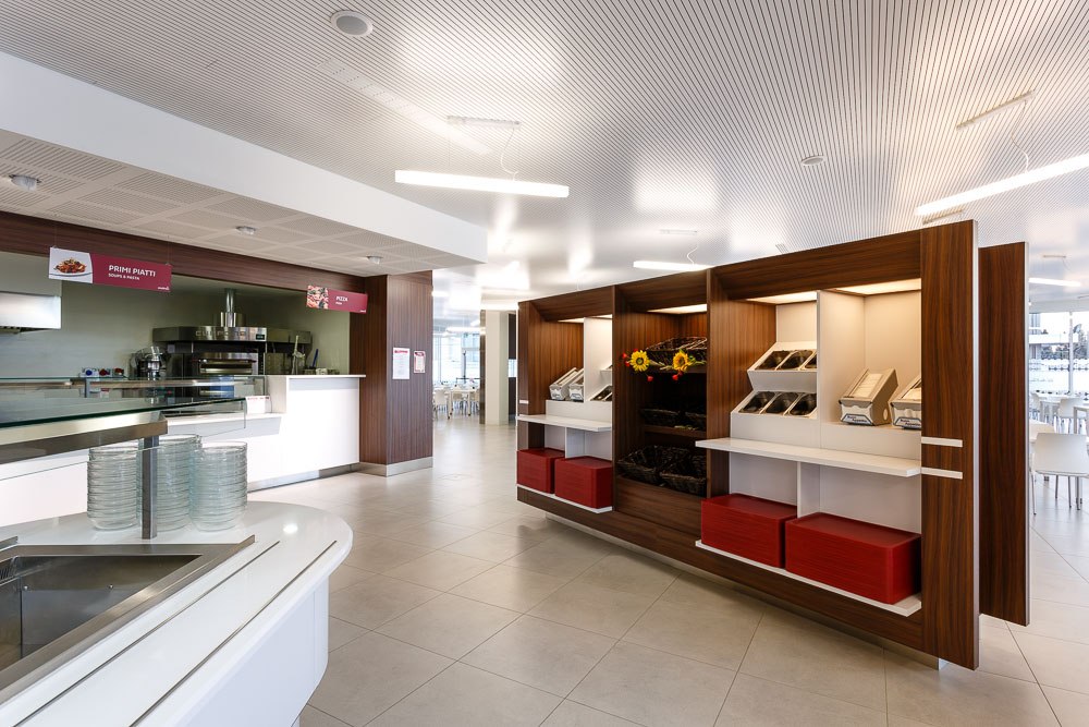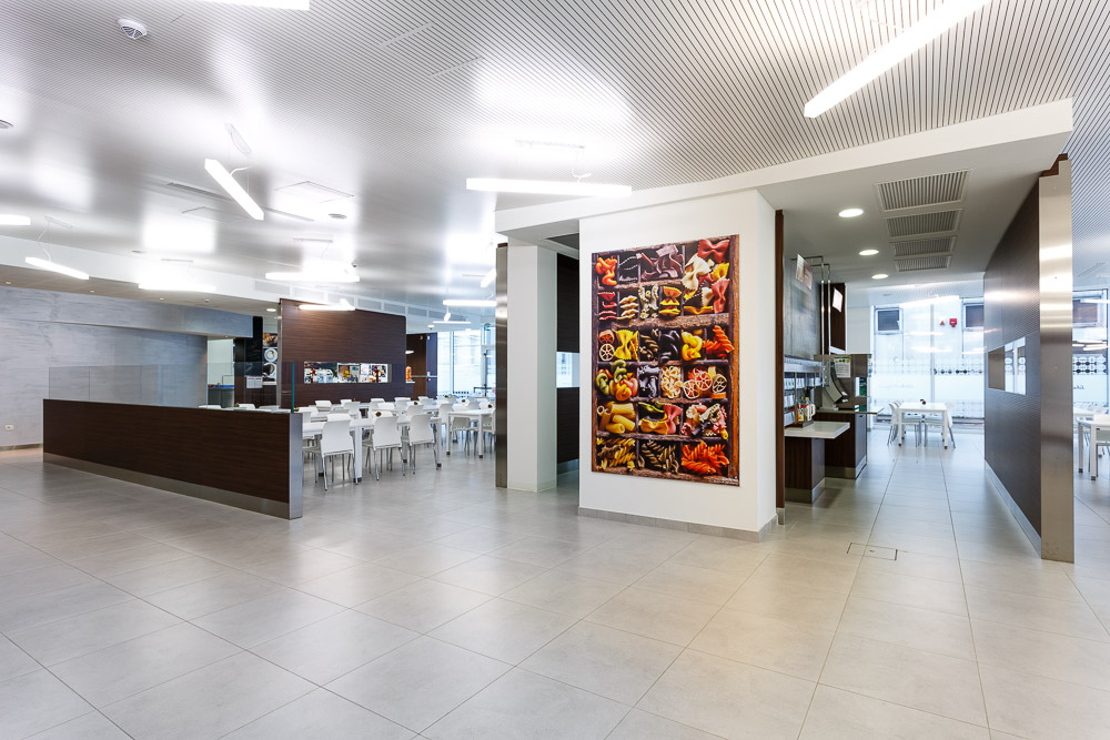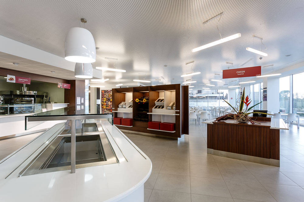 In un contesto aziendale strutturato, anche gli spazi dedicati alla pausa e alla ristorazione interna assumono un ruolo strategico. Le immagini documentano l’architettura dell’ambiente, la disposizione dei tavoli e la relazione tra superfici, luce e materiali.