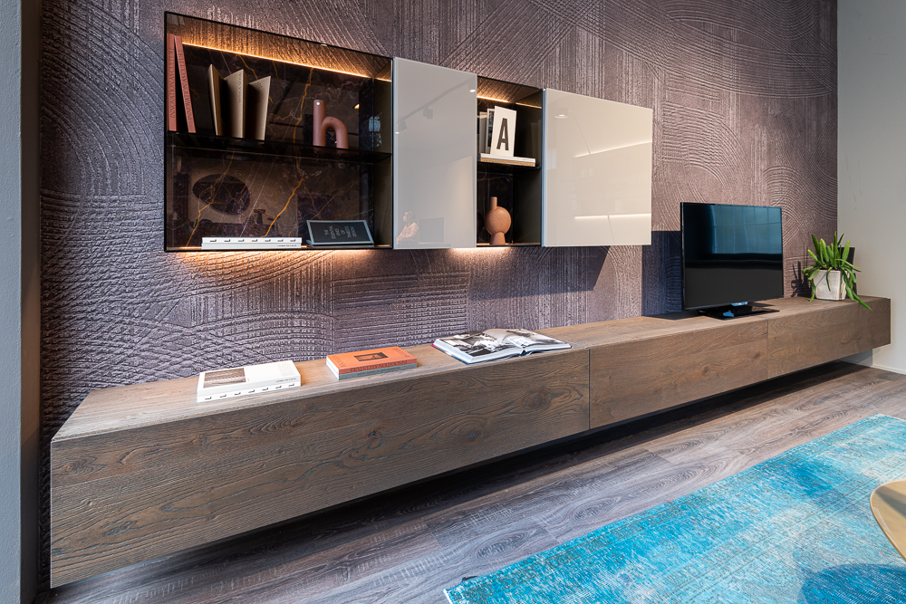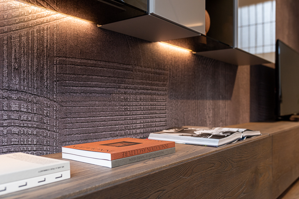 Lo showroom si sviluppa come ambiente modulare, in cui sistemi living, cucine e soluzioni contenitive convivono in un percorso espositivo coerente. Le riprese sono state organizzate in funzione dell’illuminazione artificiale e delle caratteristiche volumetriche dello spazio.